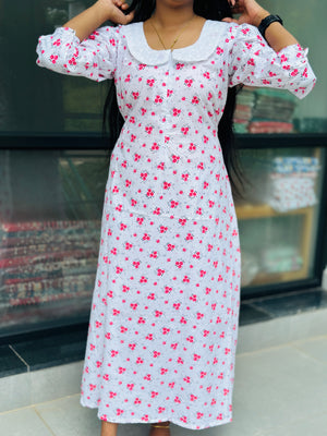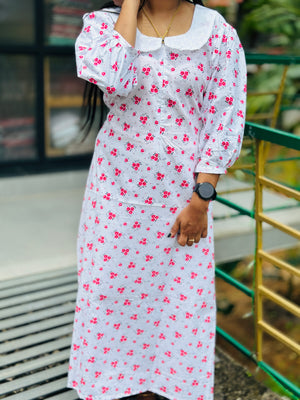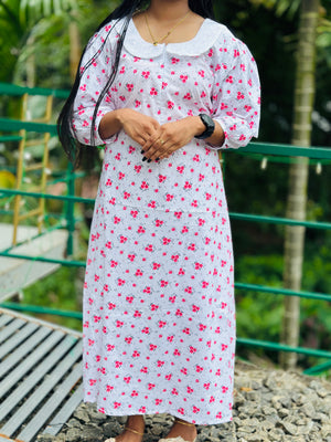 3/4 sleeve Peterpan feeding frock in free size &length 48”