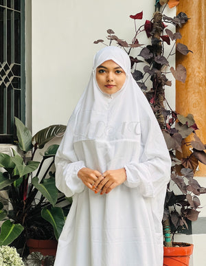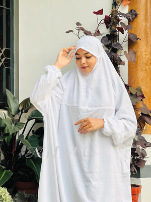 Our one-piece prayer jilbab offers complete coverage with a streamlined design that eliminates the need for separate garments during salah. Crafted from breathable fabric that drapes elegantly, this prayer dress features an integrated headcover and generous proportions to ensure proper movement during prostration while maintaining modesty throughout your prayers.