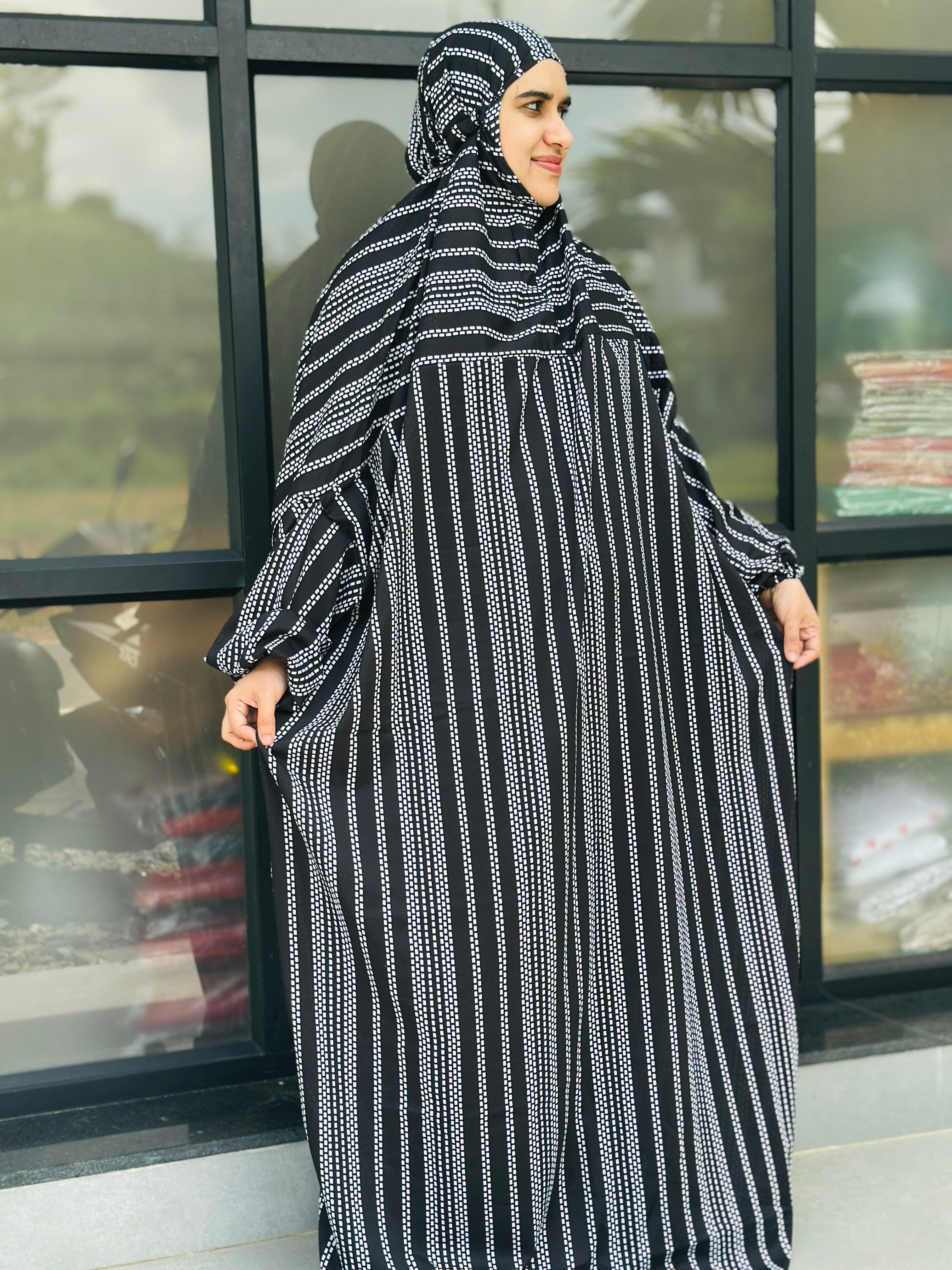 Our one-piece prayer jilbab offers complete coverage with a streamlined design that eliminates the need for separate garments during salah. Crafted from breathable fabric that drapes elegantly, this prayer dress features an integrated headcover and generous proportions to ensure proper movement during prostration while maintaining modesty throughout your prayers.